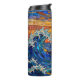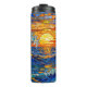 A tumbler with an illustration of a stained glass mosaic ocean waves and sunset illustration.