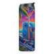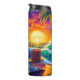 Esta imagen muestra un vibrante semi-camión azul con diseños complicados, conduciendo a lo largo de una carretera costera al atardecer. El cielo es una mezcla dramática de tonos morados, naranjas y amarillos, con la puesta de sol sobre un océano de ondas estilizadas. Las palmeras enmarcan la escena y en primer plano se ven flores tropicales y un loro que crean un ambiente fantástico y exótico.
