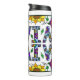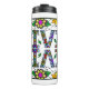 botella de agua verde azulada, rosa, violeta, amarilla, azul, roja y verde con el nombre de Olivia, flores, arcoiris y hojas de arte.