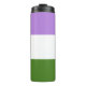 La bandera del orgullo de género es un diseño Marilyn Roxie, estéticamente similar a las banderas gay y lésbica, bisexual, transgénero, asexual y pansexual, es decir, barras horizontales de color con un significado especial. El significado de los colores en el diseño de la bandera de género es el siguiente: Lavender representa androgynes y androgyny. También representa a los "gays" en género, pues la lavanda es un color que ha estado asociado con la "rareza" , incluyendo comunidades gays, lesbianas y bisexuales. El blanco representa la identidad de género, congruente con el blanco neutral de género en la bandera del orgullo transgénero. Dark Chartreuse Green: The inverso of the lavender color; representa la identidad de "tercer género", es decir, aquellos cuyas identidades se definen fuera y sin referencia al binario.