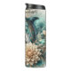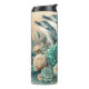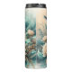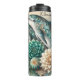 Esta imagen muestra dos delfines con patrones intrincados y ornamentales que se asemejan a mandalas o paisajes en tonos verde azulados y blancos. Están surgiendo de manera elegante de un arreglo exuberante de suculentos, rosas y varias plantas verdes y azules. La paleta de colores es predominantemente verde azulada, blanca y naranja pálida, lo que crea un ambiente tranquilo y artístico bajo el agua o en el jardín.