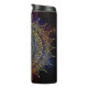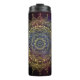 Magnífico diseño circular floral mandala termal tumbler en oro luminoso sobre fondo nebuloso oscuro, inspirado en el arte corporal mehndi henna. ¡Ideal para llevar a tu clase de yoga o gimnasio!
