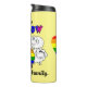 Esta Tumbler Térmica presenta un rebaño de ovejas caprichosas. Hay cinco ovejas blancas y una con los colores de la bandera LGBTQ. El texto en el dice: 'Soy La Oveja ARCOÍRIS De La Familia'. Este diseño rodea la parte delantera y los dos lados del tumbler. En la parte posterior hay un corazón con los colores de la bandera del arcoíris. El color de fondo se puede personalizar.