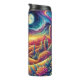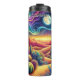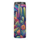 Este ilustracion surrealista representa un vibrante paisaje desértico bajo una luna llena y un cielo giratorio y colorido como una aurora llena de estrellas. Diversos tipos de cactus y flora desértica en tonos psicodélicos pueblan las dunas de arena y el terreno rocoso, creando una escena de ensueño y de otro tipo.