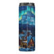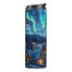Panoramic stained glass winter village, glowing house windows, snow-covered rooftops, twilight blue sky with auroras, 3:1 ratio, warm Christmas feel, detailed yet soft glass texture