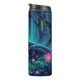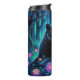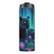 Este mágico ilustracion representa un elegante pantero negro con ojos turquesa brillantes y salpicado de puntos luminosos, que descansa en un bosque lleno de flora bioluminiscente. Los árboles y el subcrecimiento emiten un suave y colorido resplandor en tonos azules, verdes y rosas, creando una escena nocturna soñada y encantada.