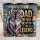 Este poderoso gráfico muestra un llamativo y colorido retrato de lobo con ojos penetrantes amarillos contra un fondo de madera escarpado y texturado. El texto en negrita "DAD", seguido de "EL HOMBRE, EL MITO, LA LEYENDA", aparece de forma destacada junto al lobo. Este diseño es un tributo fuerte y apreciativo, que celebra la fortaleza perdurable y el estatus legendario de un padre.