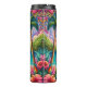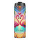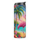 Este animado ilustracion estilizado representa dos flamencos rosas sobre una playa de arena, con el cuello en forma de corazón. Detrás, un océano tranquilo con un reflejo solar se extiende hacia un cielo dramático lleno de nubes de colores. Dos palmeras altas rodean el lugar y el primer plano está adornado con flores tropicales exuberantes y hojas en tonos rosas, naranjas y morados. En la parte superior de la imagen, un borde ornamentado con temática cardíaca, realza el ambiente romántico y exótico.