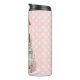 El diseño de este vaso de bebidas presenta un moderno castillo de galletas de pan de jengibre pastel hecho con 4 capas de galletas. Los colores son rosa claro, azul claro y verde claro y el bronceado sobre un fondo rosa claro con copos de nieve blancos.
