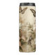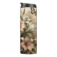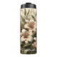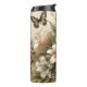 Esta serena y elegante imagen se caracteriza por un exuberante ramo de flores de lirio en tonos pastel suaves, blanco y rosa claro. Las flores están adornadas con hojas verdes y algunos capullos de lirios sin abrir. Tres mariposas marrones y blancas con intrincados patrones de alas revolotean alrededor del ramo, una en la parte superior izquierda, otra en la parte superior derecha y otra en la parte inferior izquierda. El fondo es un patrón floral suave y descolorido en un tono de luz similar, realzando la estética suave y etérea.