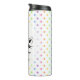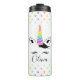 El Tumbler Termal Pastel Unicorn diseñado por Enchantcapy Design Company presenta una cara de unicornio dulce con grandes pestañas y un cuerno de unicornio en arcoiris pastel. Un patrón de estrellas arcoiris pastel acentúa el fondo. Personaliza tu elección de nombre!