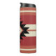 Patrón bohemio étnico azteca con formas geométricas en rojo, naranja, gris y negro sobre fondo rayado
