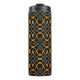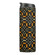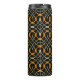 Un hermoso, intrincado, geométrico diseño de un nudo celta naranja y azul sobre un fondo negro, con una textura moderna y metálica.