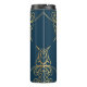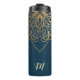 Un patrón de hermosos mandalas de oro repetido en un patrón adornado de damasco. El oro brilla para imitar el Relieve metalizado oro real. Los mandalas están diseñados con intrincadas líneas dibujadas a mano y colocados sobre un fondo azul marino profundo. ¡personalizar el monograma en el marco!