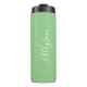 Personalice su nombre verticalmente en blanco Script Text en el fondo del sabio. Haga clic en "Personalizar" para cambiar colores y estilos de tipo.
