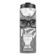 Un gatito adorable envuelto en una bufanda, llevando gafas y llevando café en un vaso térmico personalizado.