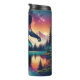 Una colosal silueta de Bigfoot domina un sereno lago montañoso al crepúsculo, su forma revela un impresionante paisaje interior de picos nevados y un cielo estrellado por la noche. En los alrededores hay pinos altos y un colorido gradiente de puesta de sol que refleja el agua, lo que da a entender un místico encuentro en el corazón de la naturaleza.