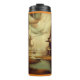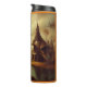 Este es un paisaje medieval con criaturas de fantasía y una casa en primer plano. En el fondo hay edificios y una extraña criatura gigante tipo nube. Un río corre desde el primer plano hasta el fondo y los pájaros vuelan alto en el cielo. Este diseño es perfecto para los amantes de la fantasía y de los paisajes fantásticos.