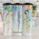 Esta pintura acuarela tiene tres macetas de flores vibrantes y un frondoso follaje colgando de una cuerda. Las flores, representadas en suaves lavados de rojo, rosa y amarillo, contrastan con las hojas verdes que fluyen. El estilo artístico y relajado y la serena paleta de colores crean un ilustracion botánico hermoso y tranquilo.