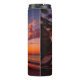 Una playa tropical al atardecer, con aguas tranquilas, un cielo colorido y palmeras elegantes, crea una magnífica taza de viaje.