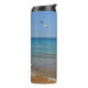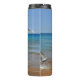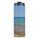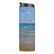 Vibrante fotografía de gaviotas volando bajo la línea costera de una playa de arena dorada.