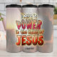 Este gráfico dramático declara poderosamente "Hay PODER en nombre de JESÚS" en una tipografía en negrita, brillante de naranja rojo y blanco. Los tornillos relámpagos iluminan el texto, enfatizando su fuerza divina. El mensaje espiritual se sitúa contra un vibrante cielo de amanecer, con una entrada vacía de una tumba y una cruz de silueta, que simboliza la resurrección y una inmensa autoridad espiritual.
