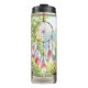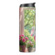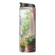 A gorgeous tumbler with an ai illustration of a beautiful pink feathered dreamcatcher hanging in the window with a shelf of pink and white potted flowers under it, overlooking a yard full of Lucius green trees.