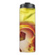 Foto de cerca de un futbolista con una camiseta amarilla con una pelota de fútbol en llamas.