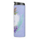 Water-colored hummingbird, pansies and hydrangea petals on a lilac wavy background. Text is customizable, which is in lilac.