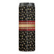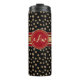 Tumbler térmico de glam de la mujer hecho en negro con puntos de polka purpurina de oro. Una cinta roja de satén, con cuentas de oro, recorre el centro del tumbler. Un medallón de oro y rojo decorativo, en el centro delantero tiene un monograma de tres letras listo para personalizar.