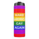Esta obra de arte incluye un tazón de lluvia y la frase "Haz que América sea gay de nuevo".