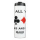 Desearía a tu compañero de puente pensamientos felices con este tumbler termal de actitud puente que presenta los cuatro trajes de cartas junto con el dicho "Que todas tus finezas y llamas hagan". Haga que otros hagan una doble toma en la mesa del puente con una dosis de buenos deseos para un excelente juego de puente con este memorable puente diciendo tumbler térmico!
