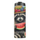 Este alegre ilustracion cuenta con un mapache vestido con un gorra de paja adornado con bayas y hojas, con una jugosa tajada de sandía. La escena es un picnic de verano soleado, con una canasta llena de frutas, un frasco de limonada con paja, abejas zumbantes y un paisaje luminoso e idílico con un río y flores en el fondo.