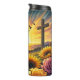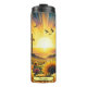 Tres rústicas cruces de madera se encuentran majestuosamente sobre una colina rodante, en silueta frente a una brillante puesta de sol o amanecer. La luz dorada emana del horizonte, iluminando un vasto campo de girasoles vibrantes y rosas rosa y amarillas exuberantes en primer plano. Las aves se elevan en el colorido cielo, agregando un sentido de asombro pacífico a este poderoso paisaje espiritual.