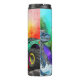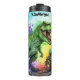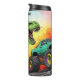 Two fierce dinosaurs, a vibrant green T-Rex roaring with an open mouth and a blue raptor, stand beside a teal monster truck with purple wheels. A dynamic rainbow splash background with colorful splatters creates an exciting and action-packed prehistoric and mechanical fusion scene.