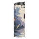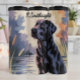 Este elegante ilustracion presenta un Labrador negro con una mirada atenta, sentado al borde de un cuerpo de agua. El fondo está formado por follaje abstracto de color mudo en tonos azules, púrpura y naranja, que sugiere cañas o gramíneas altas. El arte tiene una estética tranquila, natural y algo nostálgica. Palabras clave: