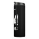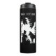 Esta botella termal de tambor para mantener las bebidas frías o calientes tiene una silueta negra de la pequeña capucha roja en el bosque sentado bajo árboles con flores hablando con el lobo. Personalizar el texto con la plantilla.