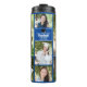 Este moderno vaso de agua termal de collage de fotos para estudiantes de grado superior azul presenta tus 7 fotografías favoritas para estudiantes. Este regalo para el mantenimiento de la graduación incluye una tipografía blanca elegante de tu nombre de instituto o universidad para la clase de 2025. Personalizar este diseño con tu año de graduación por debajo de la tapa de grad negra.