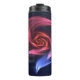 Tumbler térmico diseñado con composición de forma abstracta original, diseño fractal que parece un vórtice energético torcido o giratorio. La imagen también puede recordar una flor de fantasía abstracta con una corolla espectacular o puede inspirar una rotación cósmica o galaxia desconocida. La combinación de colores se basa en tonos azules y rojos, que por lo general le dan un encanto especial.