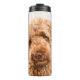 Un retrato de estudio de un perro doodle dorado mirando la cámara.