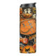 This Halloween pattern has a vintage, retro-inspired theme. The design features a collage of classic Halloween elements in vibrant orange, black, and gold tones. Key imagery includes a sleek black cat with a mischievous expression, grinning jack-o'-lanterns, and elegant witches in flowing gowns.