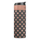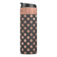 Tumbler térmico de moda hecho en un patrón de punto de polka de color gris oscuro y purpurinoso de aspecto rosa dorado, con una banda de aspecto de Relieve metalizado oro rosa sólido, en la parte superior. Personalice el texto negro para leer lo que desee. Gran idea de regalo para ella.