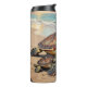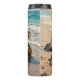 A coastal themed tumbler with an illustration of a mama sea turtle and baby crawling into the blue ocean waves on a sandy beach.