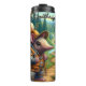 Este es un ilustracion caprichoso y detallado de un armadillo en una caminata por un bosque encantado. El armadillo está vestido con equipo de senderismo, que incluye una mochila, un gorra y botas, y sostiene un bastón para caminar. La mochila contiene un mapa de aumento, brújula y otras herramientas. El bosque es exuberante y colorido, con un río sinuoso, árboles altos y varios tipos de setas resplandecientes y manchadas. La estética general es mágica y serena, con un toque de aventura.