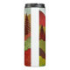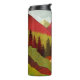 Un paisaje abstracto con texturas únicas que muestra un paisaje montañoso con senderos de senderismo y árboles y hermosos rayos de sol en tonos rojos, crimson, amarillos y verdes.