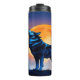 Un majestuoso lobo azul y negro se para en una pequeña alameda, con la cabeza lanzada de vuelta en un aullido dirigido a una inmensa luna de miel. Pinos de madera de silueta rodean el espectacular cielo nocturno, que pasa de un azul profundo en la cima a un naranja que brilla alrededor de la luna. Una ligera bruma se cierne sobre el suelo, añadiendo a la mística atmósfera de la noche del desierto.