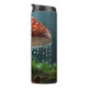Una sola seta se levanta firme y recta bajo una fuerte lluvia, el agua bombeando sobre su gorra y goteando por los costados sobre hojas cortas de hierba y musgo.