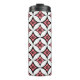 Tumbler en un Shippo japonés tradicional, o "siete tesoros" estampados en círculos entrelazados con un motivo central de flor - flores rosa de coral con un fondo con estampado negro y blanco