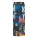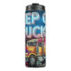 Esta imagen presenta una vibrante semi-camioneta con un trabajo de pintura en gradiente rojo, amarillo y púrpura, estacionada en una superficie húmeda y reflectante por la noche. Encima del camión, grandes letras de estilo neón brillan con la frase "MANTENTE EN TRUCKIN'". El fondo muestra un cielo oscuro y nublado y sutiles indicios de otros signos de neón, creando una atmósfera clásica de parada de camiones.