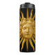 Símbolo de Luis XIV el Rey Sol (Roi Soleil) en la puerta dorada del castillo de Versalles con fondo negro
